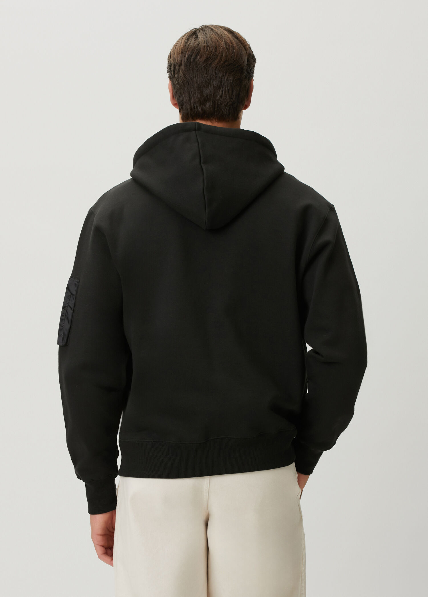 Толстовка Alpha Industries Utility Pocket Hoodie - толстовка свободного кроя, выполнен из смеси материалов - 80% хлопка и 20% полиэстера. На рукаве есть нашивка Alpha, на нижнем крае толстовки фирменная нашивка. Толстовка утеплена флисом. На рукаве фирменный сервисный карман из нейлона с лентой Alpha Industries на кольце.