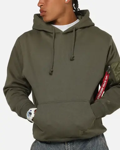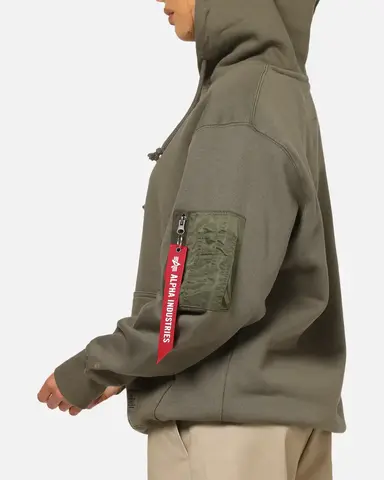 Толстовка Alpha Industries Utility Pocket Hoodie - толстовка свободного кроя, выполнен из смеси материалов - 80% хлопка и 20% полиэстера. На рукаве есть нашивка Alpha, на нижнем крае толстовки фирменная нашивка. Толстовка утеплена флисом. И на рукаве фирменный сервисный карман из нейлона с лентой Alpha Industries на кольце.